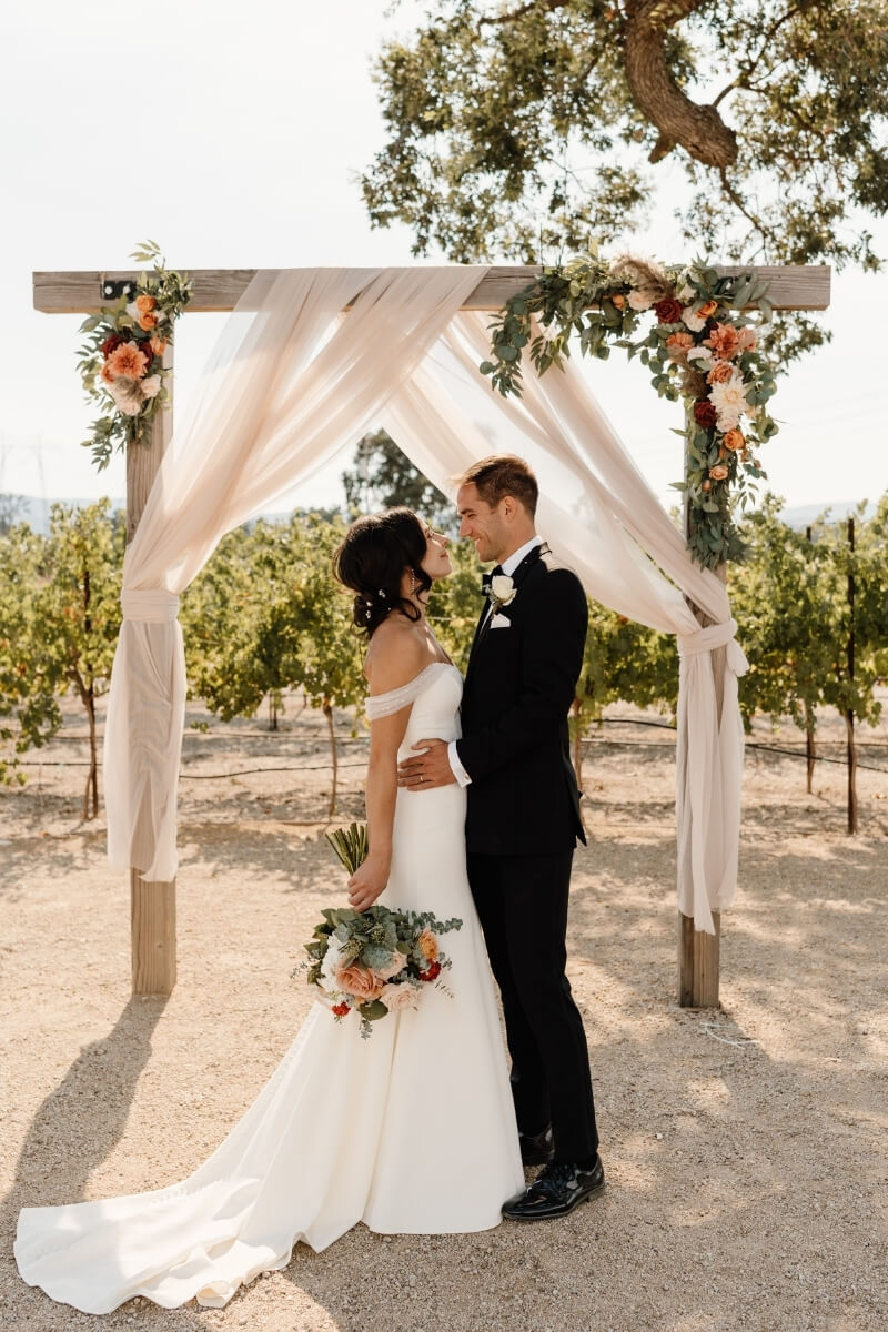 This venue is set in a scenic location surrounded by vineyards and rolling hills. It features a customizable built-in archway that can be decorated with florals, linens, or kept simple for a timeless look.